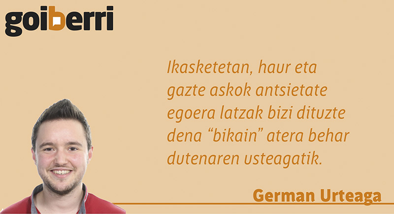 Gogoan dut institutuko lehen urteetan “bikain” piloz beterik nuela motxila, baina aldi berean gogoan dut nire buruari zer presio jartzen nion eta nola azterketa aurreko gau askotan antsietateak bisitatzen ninduen, nahiz eta dena hitzez hitz jakin. Noizbait azterketa bat suspenditu nezakeela pentsatzeak panikoa ematen zidan, dena kontrolpean eduki ezin izateak izugarrizko beldurra ematen zidan, horregatik ikasten nuen guztia hitzez hitz. Eta bai, notak izugarriak ziren, baina nire antsietatea ere izugarria zen. Gurasoek lagunduta laguntza profesionala eskatu nuen, izugarrizko emaitzak lortu arren sufritzen ari nintzelako, paper txuriaren aurrean txuri geratu nintekeenaren ideiak barrua jaten zidalako, ezin nuelako ikasgai gehienetan 9 bat baino gutxiago ateratzea onartu…