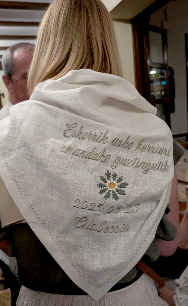 Ekainaren 23an, Olaberriko San Joan bezperako suaren ekitaldian, Arrieta jatetxeko lau belaunaldi elkartu ziren, herriaren esker ona jasotzeko. 92 urteko Mariajesus Kerejeta ama, Mariaje Bastida bera, Nerea alaba eta Uxue biloba. Argazkian ikus daitekeen zapia eman zieten opari, ‘Eskerrik asko herriari emandako guztiagatik’ esaldia brodatuta. Jatetxean bertan dute jarrita.