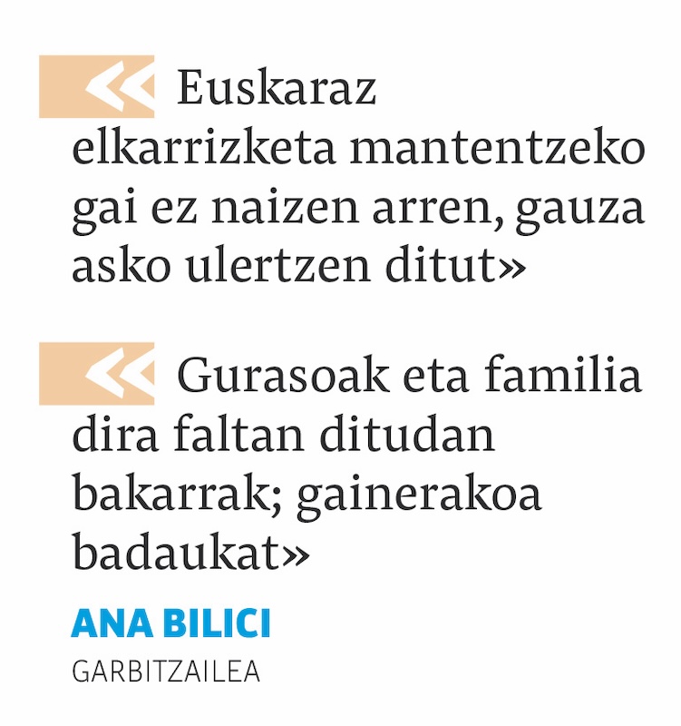 Azkenaldian, gainera, eskolako gurasoen kuadrillan murgilduta dabil, eta euskara ez jakin arren, herritarrek momentu oro eskaintzen dioten laguntza azpimarratu du: «Bilerak euskaraz egiten dira, baina itzulpenak egin eta azalpenak ematen dizkidate etengabe. Oso eskertuta nago, eta gutxika-gutxika gero eta gehiago ulertzen ari naiz».