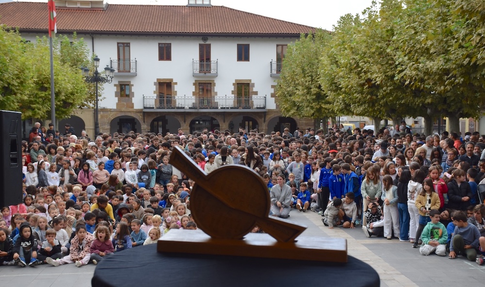 Eskultura Antton Mendizabalek egina da, 1997an. Kilometroak antolatzea egokitzen zaienen artean, ikastolaz ikastola erabiltzen dute. Zurean zizelkatzen dute urtea eta herria. ■