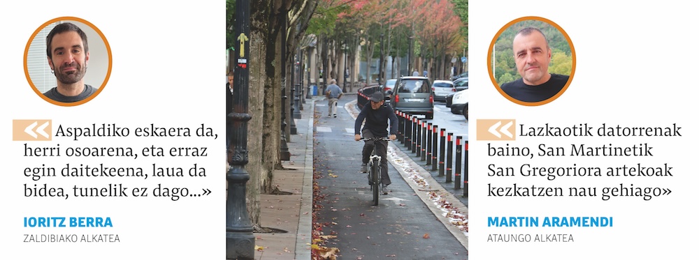 Bi bidegorriak beharrezkoak ikusten ditu Aramendi alkateak, «izugarria da zer auto pasea dagoen, batez ere San Martingo herri gunean, eta herri osoan orokorrean. Gasolindegi parean dagoen trafiko neurgailuaren arabera, egunean batez beste 4.000 kotxe pasatzen dira. Etxe bakoitzean bi-hiru ibilgailu daude, mendira ere jende asko etortzen da… Hori arintzeko bidegorri egokia edukitzeak asko lagunduko luke, jendeak lanera joateko erabiliko lukeelako». ■