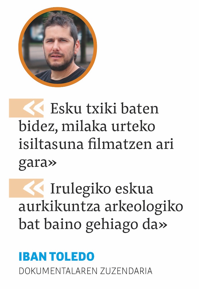 Iban Toledo beasaindarra ‘Eraukon, eskuaren mintzoa’ dokumentala ari da egiten, Irulegiko eskuaren aurkikuntza, euskararen lehen aztarna izan daitekeenaren balioa nazioarteko ikusleari hurbiltzeko.