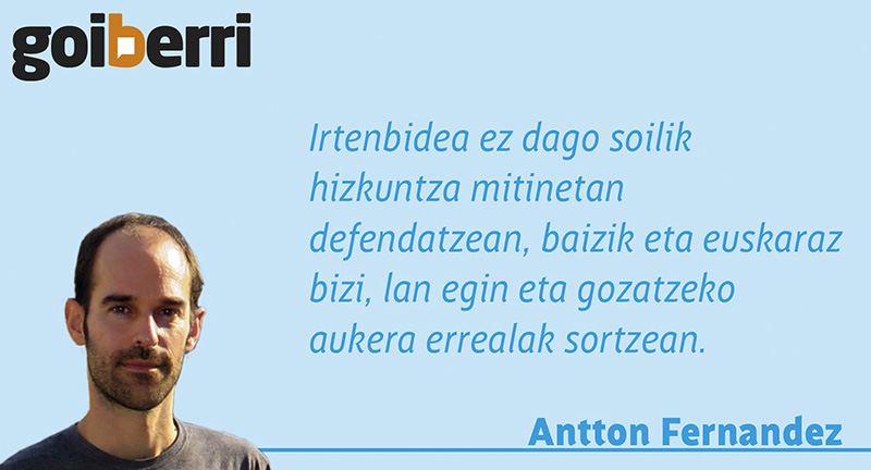 Abenduak 3+2 ditu Goiberri-ko zenbaki hau argitaratu den egunak. Euskararen nazioarteko eguneko mezu eta ekitaldi zaparrada atertzen hasi da dagoeneko. Idealizatutako Goierri eskualdea, bere herri txikiek eta mendiz inguratutako paisaiak osatuta, euskararen bihozgunerik sendo eta bizienetakoa izan da historian. Baina gaur egun, zer esan nahi du euskaraz bizi ahal izateko zinezko apustua egiteak?