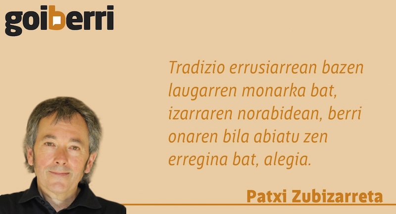Hala esaten zaio euskaraz sortaldeari, hau da, eguzkia ateratzen den aldeari, ekialdeari, alegia. Eta egunotan, bereziki, erraz gogoratu gaitezke handik datozen hiru erregeekin, baina Anjel Lertxundi idazleari irakurria diogu tradizio errusiarrean bazela laugarren monarka bat, izarraren norabidean, berri onaren bila abiatu zen erregina bat, alegia.