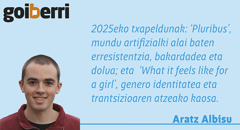 Amaitzeko, aurtengo bi txapeldunak. Bata, Pluribus. Ez dizuet gehiegi kontatu nahi: mundu artifizialki alai baten erresistentzia, bakardadea eta dolua, paisaia eta planorik ederrenetan (Getaria barne). Bestea, What it feels like for a girl: genero identitatea eta trantsizioaren atzean dagoen kaosa azaleratzen du zutabegile baten autofikzioak. ■