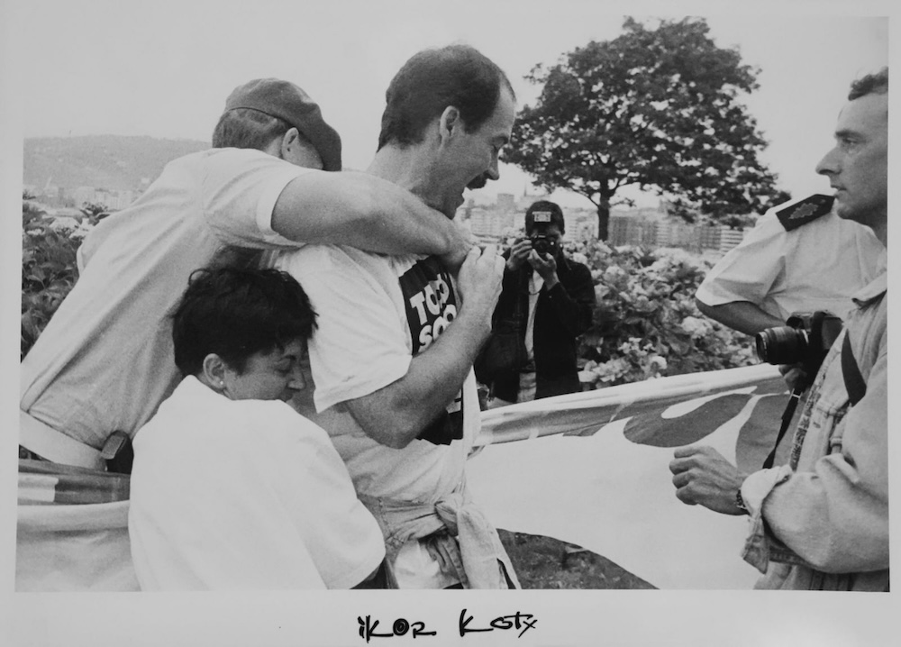 Aranburu ertzainekin borrokan ageri da. «Egiari zor, ez daukat oso egoera bortitza izan zen oroimena. Bultza egin zigutela bai, lepotik heldu ere bai, baina ez dut uste borra kolperik izan zenik. Mauka motzetan eta txapela buruan zebiltzan ertzainak, argazkian ikusten denez. Pankarta kentzeko helduko zidala pentsatzen dut, edo atxilotzeko asmotan, baina Mariasun Monzon lankideak ere gogor heldu zidan, eta, tiradizo batzuen ondoren, amore eman eta bakean utzi ninduen txapeldunak. Hura heldu beharra, denek ere! Egoera erridikulu xamarra zen eta barregura ematen zidan. Eskuinean azaltzen dena Carlos Korbella argazkilaria da. Nonbait, enkoadraketa hobeagoaren esperoan zegoen, ez baitzuen argazkia ateratzeko imintziorik egiten. Uste dut txantxa egin niola denak tiraka ari ziren bitartean: ‘Ze, atera behar dek behingoz argazkia edo goiz osoa segi behar diagu hemen espektakulua ematen?’. Egun beltz haietan barre egin nuen une bakarrenetakoa izango zen. Hura haserrea eta amorrazioa. Oraindik ez zait pasa».