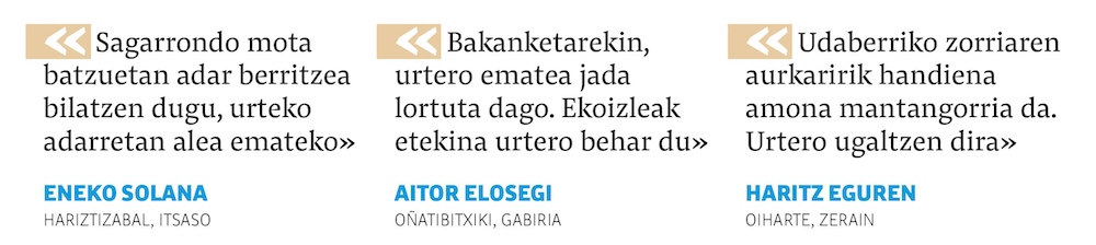 Halako ekoizpen ereduak «babesteko eta aurrera eramateko», Solanaren iritziz garrantzitsua da kontsumitzaileak sagar moten ezagueran eta bakoitzaren garaian sakontzea. «Garrantzitsua da hainbeste gustatzen ez zaizkigun motak ere hartzea. Gustukoena ere ailegatuko da, baina dauden barietateak jakiteak eta momentukoa jaten ikasteak ere garrantzia du. Jende guztia mota gutxi batzuen atzetik ibiltzen da». ■