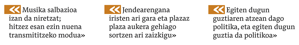 Egiten dugun guztiaren atzean dago politika, eta egiten dugun guztia da politikoa. Musikalki ere, bai idazten ditugun letrak, bai kontzertuak emateko espazioen gainean hartzen ditugun erabakiak, erabaki politikoak dira. Batzuetan kontzienteago eta beste batzuetan inkontzienteki, baina denaren atzean dago politika, baita musikalki zure proiektuarekin kontatu edo transmititu nahi izaten duzun horren atzean ere.