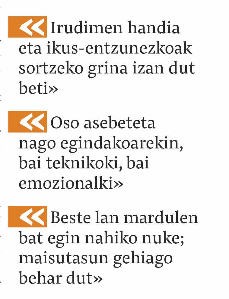 Tankera bereko beste lanen bat egitea gustatuko litzaidake. Lan mardulen bat, alegia; handia eta potoloa. Baina denbora behar da horretarako, eta teknikoki ere maisutasun gehiago. Asko dut oraindik ikasteko, baina ahal dudan heinean sortzen jarraitzea da asmoa. Urte berri honetarako ere, badauzkagu jada zenbait proiektu itxita, eta beste hainbat buruan bueltaka. Horiek guztiak aurrera atera edo ez, bereziki ilusioari zein motibazioari tinko eutsi nahi nioke. ■
