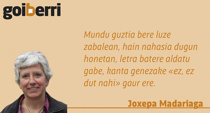 Ez, ez dut nahi, ez, ez, ez, ez holako zibilizaziorik” kantatzen genuen aspaldi. Mundua, gertukoa eta urrutikoa, mundu guztia bere luze zabalean, hain nahasia dugun honetan, letra batere aldatu gabe, kanta genezake «ez, ez dut nahi» gaur ere. Ikaragarria da arlo guztietan bizi dugun tentsioa, sufrikarioa. Tristura, pena eta inpotentzia sentitzen ditugu. Beti dauzkagu hizketarako nahiz idazteko gaiak, gai potoloak, askotan tristeak: indarkeria, errespetu eza, zapalkuntza, erasoak, gerrak. Euskararen kontrako erasoetatik hasi eta III. Mundu Gerra, gerra nuklearraren arriskua…