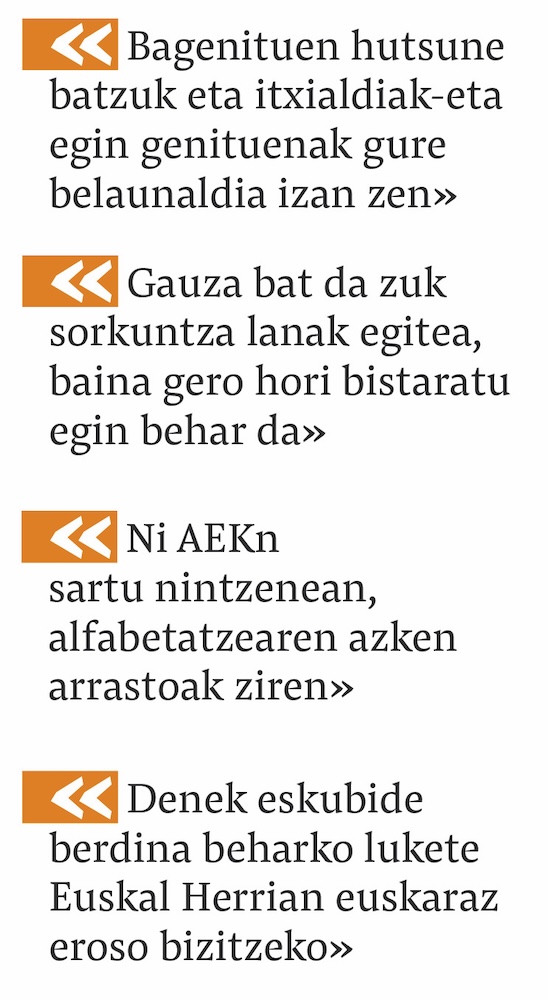 Behar horiek ikusten ziren, eta horregatik eskolan ematearena. Umeak eskolan daudenean guraso horiek bertan euskara ikasteko aukera daukate. Horrek ziurtatzen du transmisio hori. Ikustea gurasoek egiten duten ahalegina eta seme-alabek ikustea beren gurasoak nola ari diren, nik uste hori oso eraikitzailea eta garrantzitsua dela.
