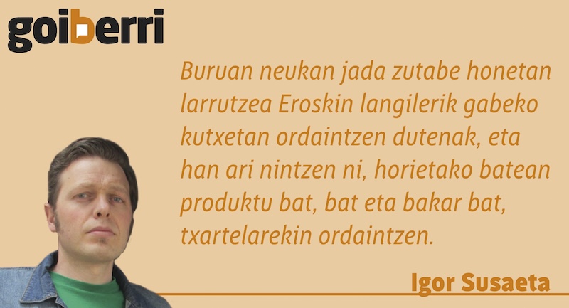 Larritu egin nintzen GoiBerri irakur dezakeen ezagun batek ikusi ninduenean. Ekintza hura egiten ari nintzenean buruan neukan jada zutabe honetan larrutzea Eroskin langilerik gabeko kutxetan ordaintzen dutenak, eta han ari nintzen ni, horietako batean produktu bat, bat eta bakar bat, txartelarekin ordaintzen, irekita zegoen langiledun kutxa bakarreko ilaran hamaika produkturekin zain zegoen morroi bakarrak ez zidalako entzun —edo ez zidalako entzun nahi izan—, galdetu nionean ea, mesedez eta arren, utziko zidan pasatzen eta aldean neraman dena delako hori kutxako langileari eskura ematen kobra ziezadan, neure buruarekin bakean geratze aldera.